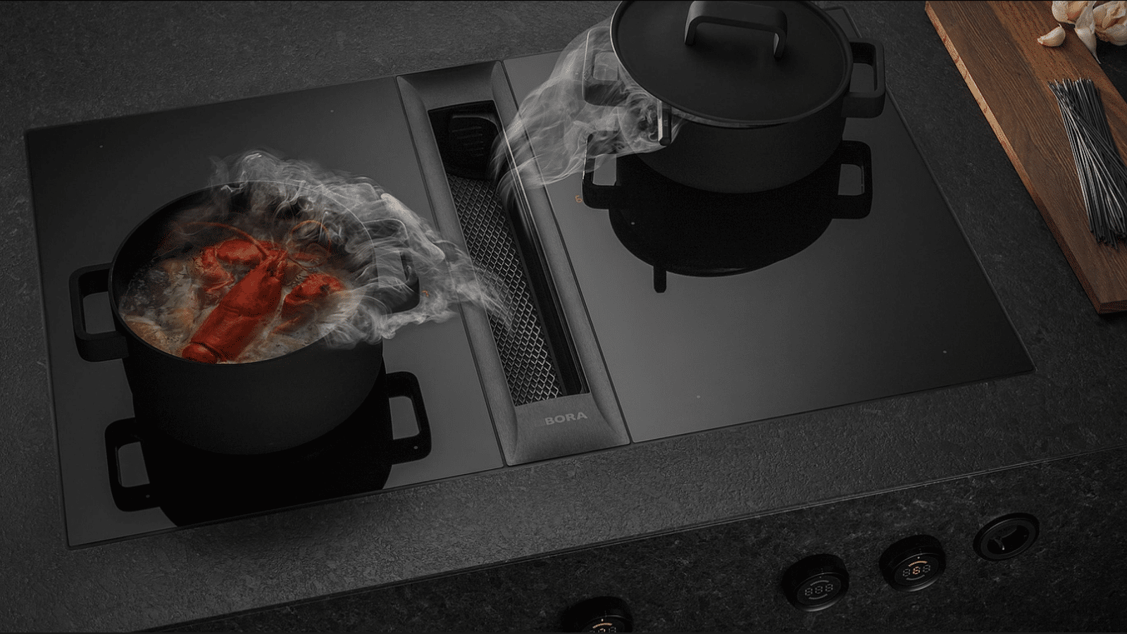 Hier afgebeeld is het vlaggenschip van Bora, de Professional 3.0. Met tussen de 3 grote kook-elementen (inductie, wok-inductie en tepan yaki) twee afzuigmodules. De intuïtief te bedienen knoppen zitten aan de voorkant van het werkblad, het afzuigvermogen wordt automatisch geregeld en het systeem is extreem stil.