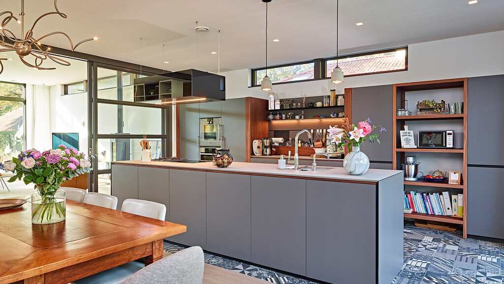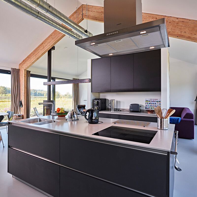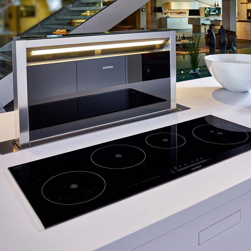 Deze afzuiging van Siemens verdwijnt in het werkblad als hij niet gebruikt wordt en vormt een mooie eenheid met de brede inductieplaat. Hij zorgt naast een prima afzuiging ook voor licht op de pannen en beschermt degene aan de andere kant van het eiland tegen vetspatten.