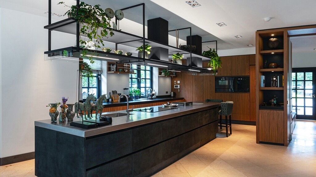 Zo'n stoer rek met afzuigmodule, in dit geval in RVS, doet het perfect in een industriële keuken. Zo is pollepel en co altijd bij de hand, heeft uw tablet met recepten een handige plek, en (kruiden)plantjes en accessoires kunnen mooi worden uitgestald. De werkbladverlichting is ook gelijk goed geregeld en in sommige uitvoeringen is het rek met een afstandsbediening in hoogte te verstellen.