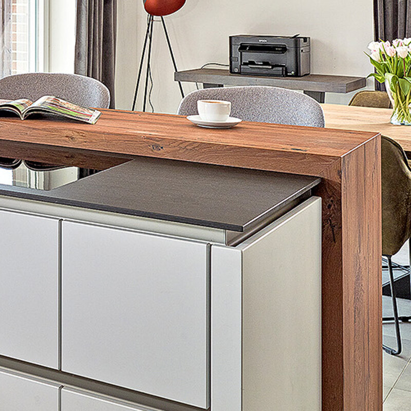 Als eerste valt de rustige kleurstelling op: Wit, zwart en warm eiken. De keuken is een Contur Biella, met greeploze fronten in witte en lavazwarte satijnlak. De hoge kasten zijn voor ongeveer tweederde ingebouwd in de wand, waardoor de kastenwand lichter, minder massief werkt. Voor het werkblad koos Markus heel bewust voor keramiek: Neolith Basalt Black. Keramiek is uiterst sterk, hittebestendig en krasvast. Het blad is slechts 12 mm dik.