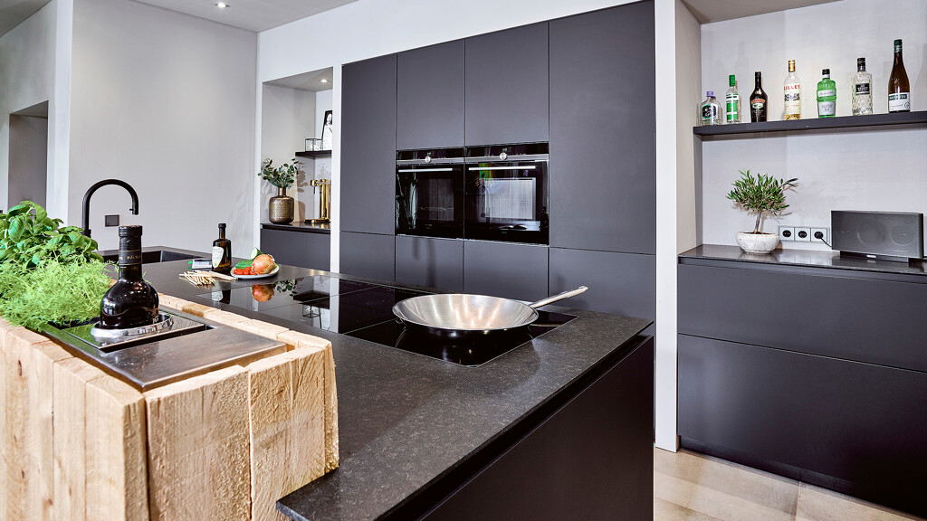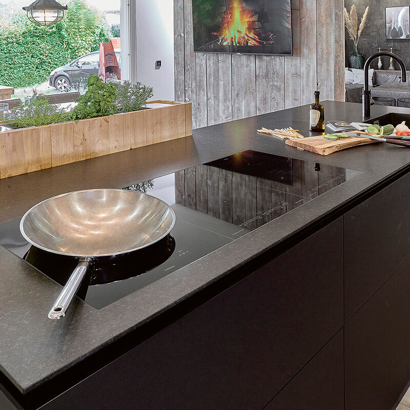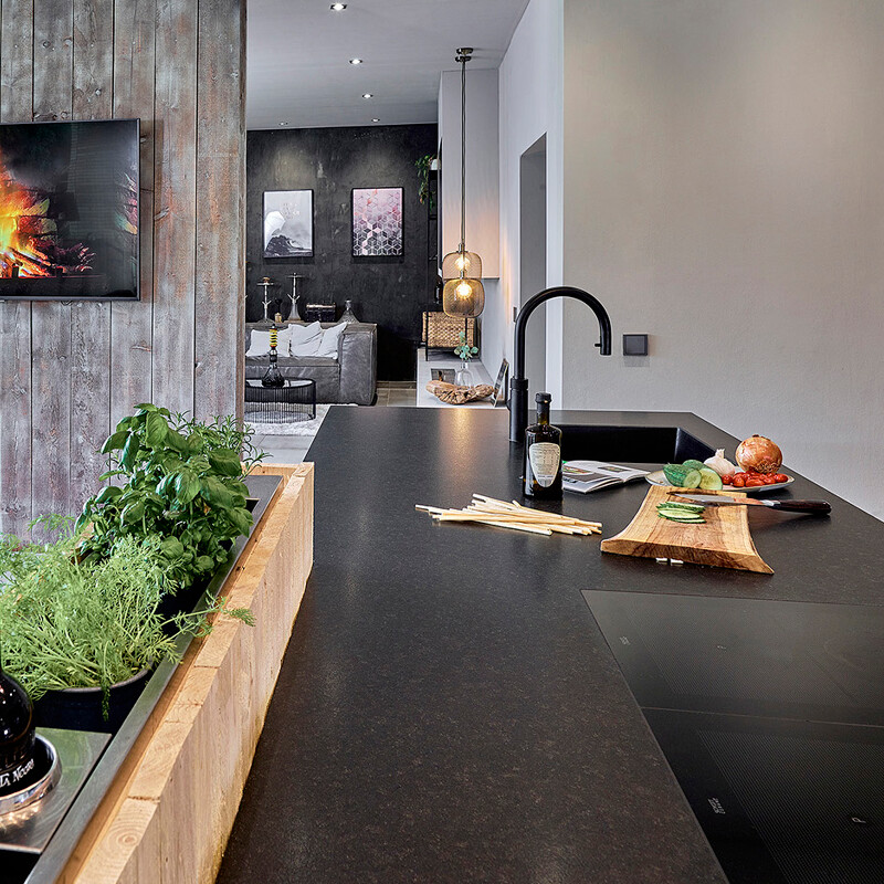 Voor het keukenblad werd gekozen voor natuursteen: graniet Nero Assoluto met een matte Lappaduro Fino afwerking. Nort koos voor de optiek van een dunne rand, Falzkante in het Duits, waardoor de zichtkant slechts 8 mm dik is en het blad een modern en filigraan uiterlijk krijgt. Alleen aan de rand is het blad 8 mm, voor de stevigheid is de rest van het blad 20 mm, de standaard dikte van een granieten werkblad.