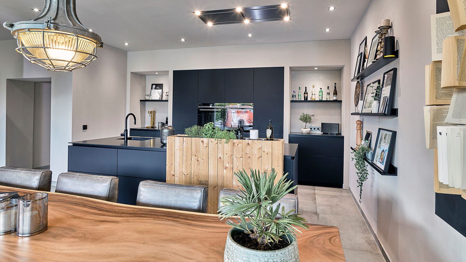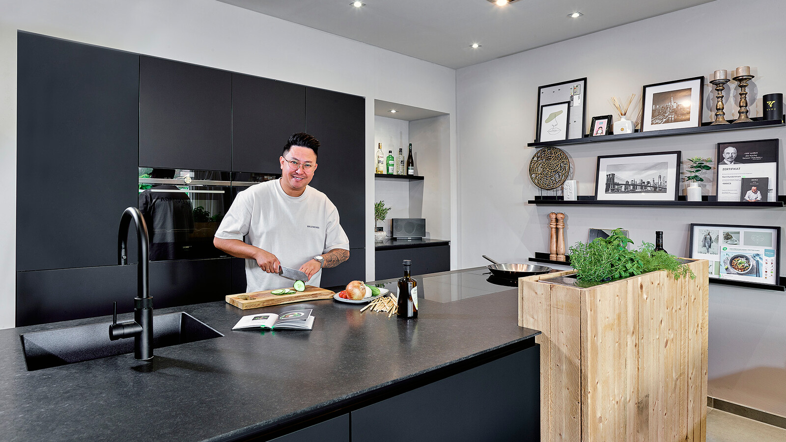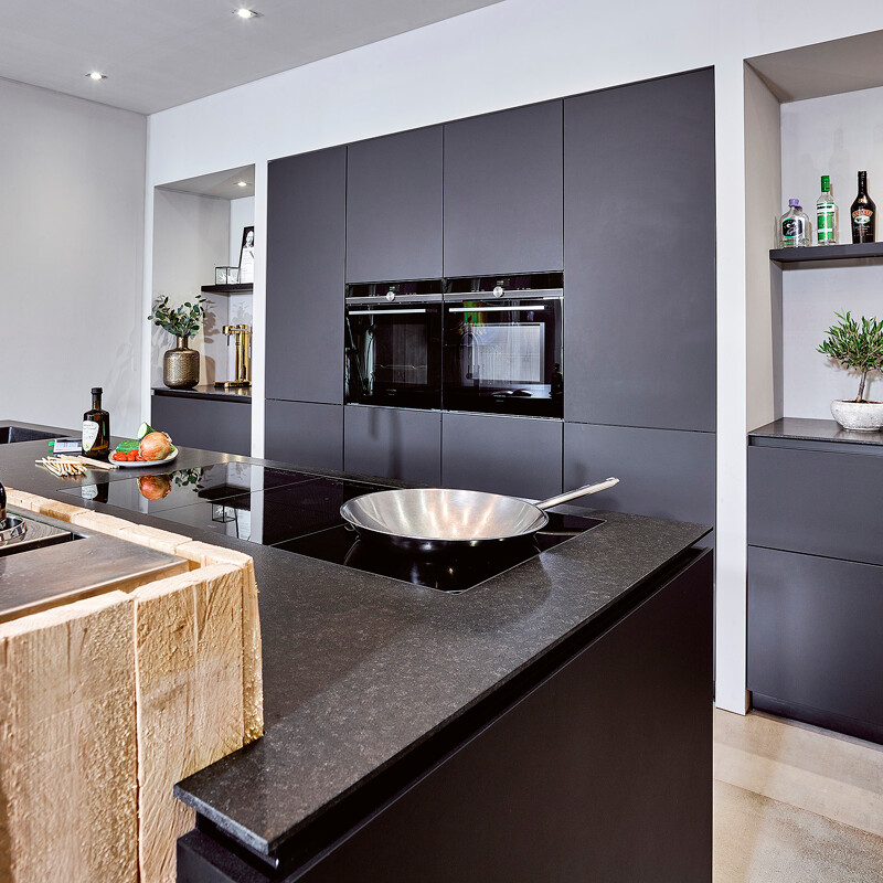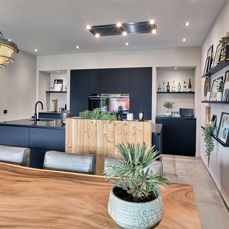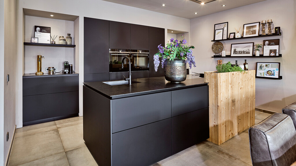 In 2019 kocht en renoveerde Nort het huis waarin hij is opgegroeid. Voor de woonkeuken werd een nieuwe aanbouw gepland. Een ding wist hij zeker: het moest een zwarte keuken worden. Chiquer en eleganter dan een witte keuken en beter passend bij de betonnen vloer en de houten accenten. In 2020 installeerden de monteurs van Ekelhoff deze ruime eilandkeuken met greeploze fronten in Onyxzwart Fenix uit de lijn NX240 van het designmerk next125. Fenix is een relatief nieuw high-tech materiaal met een supermat, fluweelachtig uiterlijk. Door gebruik te maken van nanotechnologie ontstaat een oppervlak dat sterk, hygiënisch en anti-fingerprint is. Bovendien heeft het een zelfherstellend vermogen waardoor kleine krasjes gemakkelijk met hitte te repareren zijn.