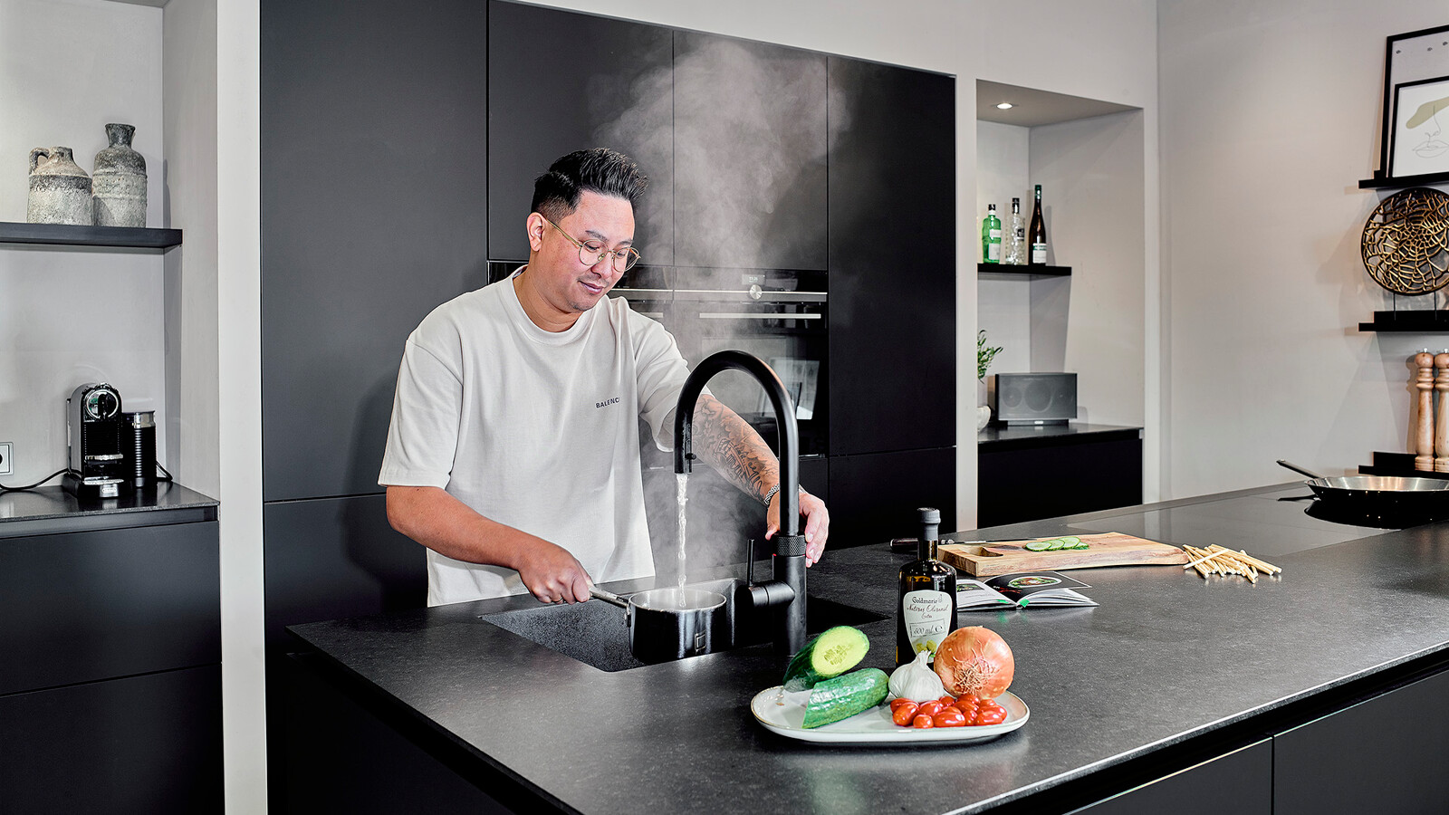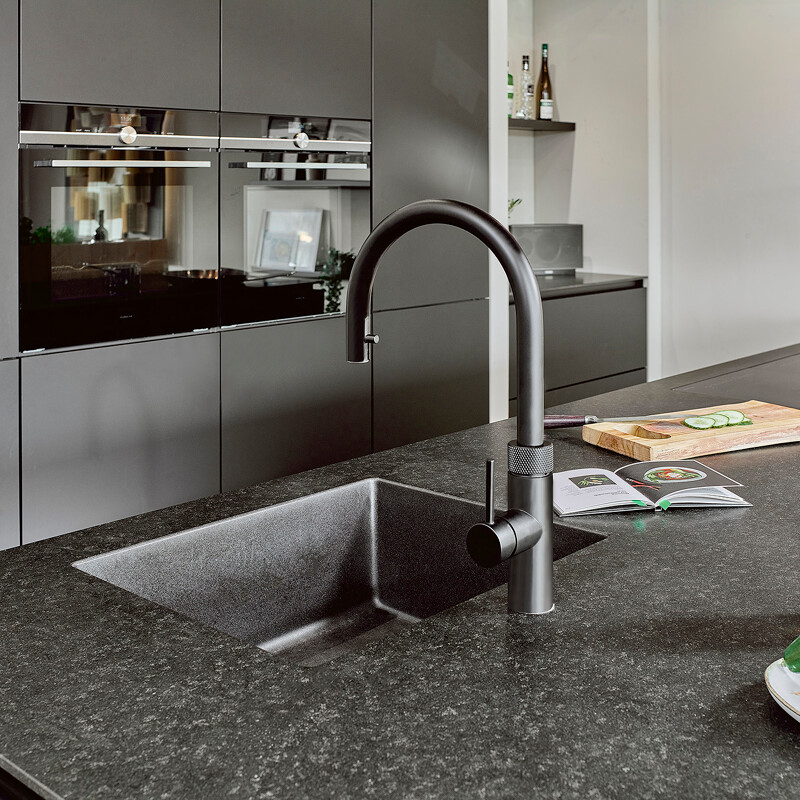 Een bijzonder mooi detail en een nieuwe techniek in de keukenwereld, is hoe de spoelbak in het werkblad is gemonteerd. Deze verbinding heet A4-Sub en is te vergelijken met een verstekverbinding. Hierdoor lijkt de zwarte Silgranit spoelbak van het merk Blanco deel uit te maken van het granieten werkblad. De zwarte kokendwaterkraan is een Quooker Flex.