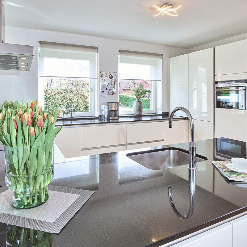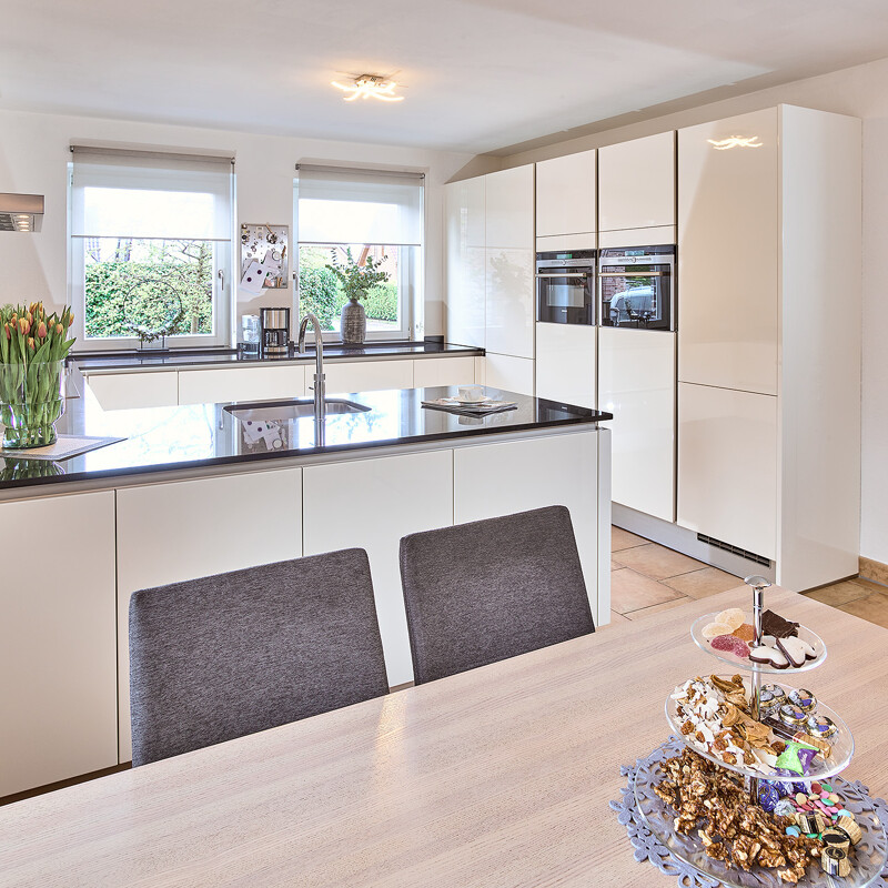 De keuken is van het designmerk next125 en heeft de kleur “briljant wit”, een warme witte teint. Thomas had één duidelijke wens: de keuken moest greeploos zijn. “We hebben dit gekozen omdat het strak oogt en gemakkelijk schoon te houden is. In 2009 waren greeploze keukens nog upcoming. SieMatic en next125 waren de koplopers die deze trend al in hun designs geborgen hadden.”