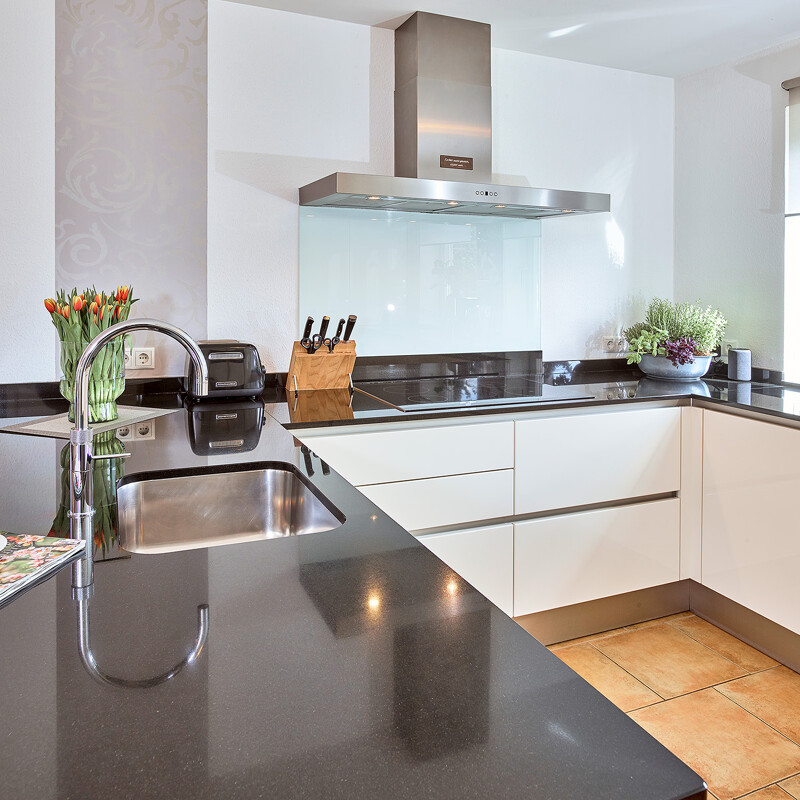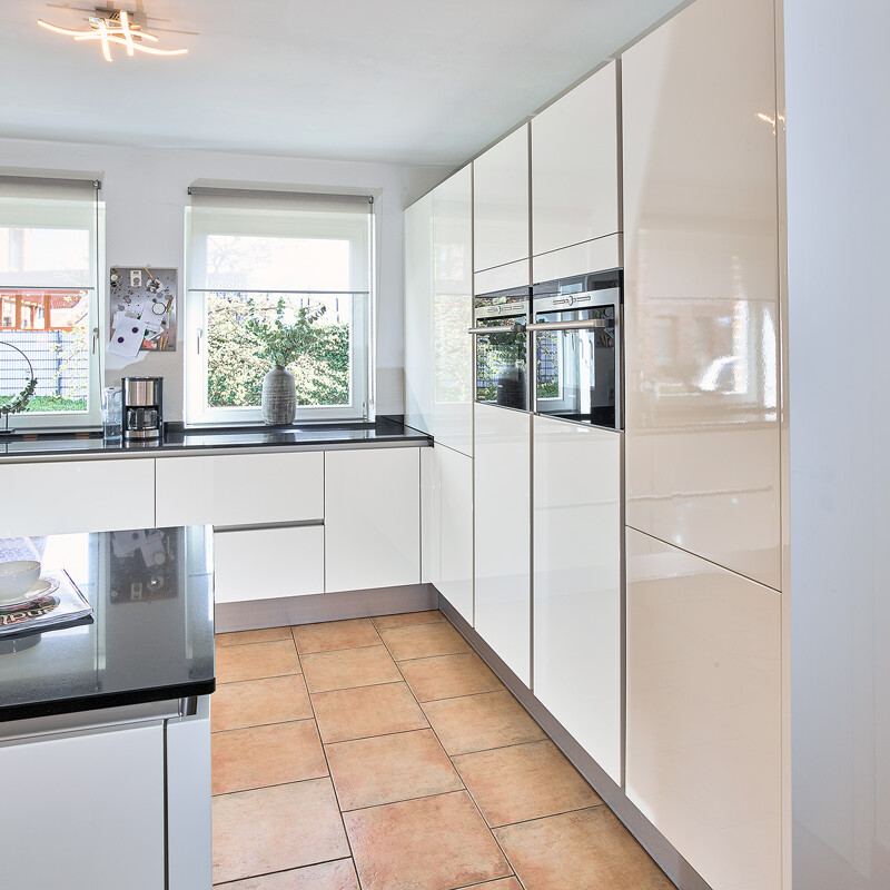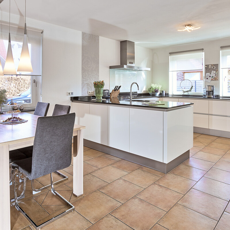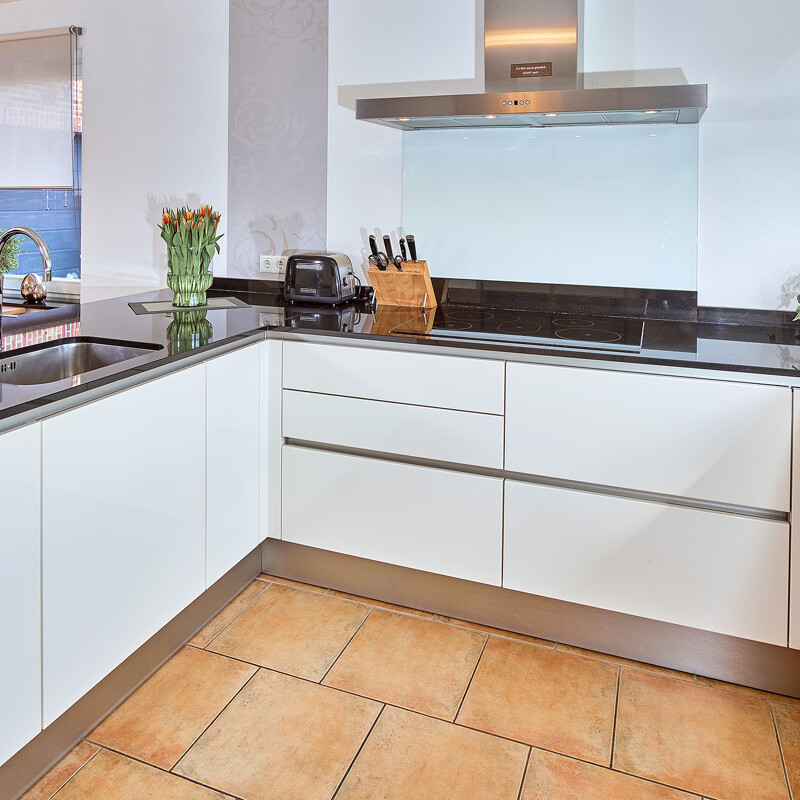 Naast de greeploze elementen en de witte kleur wordt de moderne look benadrukt door de keuze voor hoogglans. Wederom omdat dit mooi clean blijft, en het geeft een chique uitstraling. Het pikzwarte keukenblad, Nero Assoluto, contrasteert goed met het lichte wit. Het huis van Thomas en zijn familie is verder in landhuisstijl. Dit zie je terug in de terracotta gekleurde tegels op de vloer. Maar in plaats van een keuken in diezelfde stijl, kozen zij voor contrast. En dus een moderne keuken.