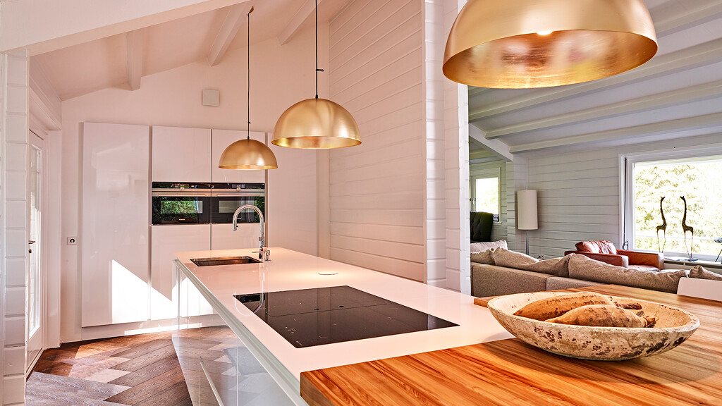 Deze royale eilandkeuken van next125 NX501 heeft fronten in kristalwitte UV-hoogglanslak en een glanzend wit composieten werkblad. De grote barplaat is van licht notenhout en biedt plaats aan 4 barkrukken. Deze werd op maat gemaakt in onze Manufaktur-werkplaats. In de hoge kastenwand bevindt zich een koelkast, een combi-stoomoven en een combi-magnetron van Siemens. Het eiland is voorzien van een Miele vaatwasser, een wijnklimaatkast, een inductieplaat met geïntegreerde afzuiging en een dubbele spoelbak met een Quooker-Flex kraan. De houten balken van het plafond en de wandplanken werden allemaal wit gelakt in dit smaakvol verbouwde huis met Scandinavische flair in de buurt van Nijmegen, dat zeer on-Nederlands tegen een berghelling is gebouwd.