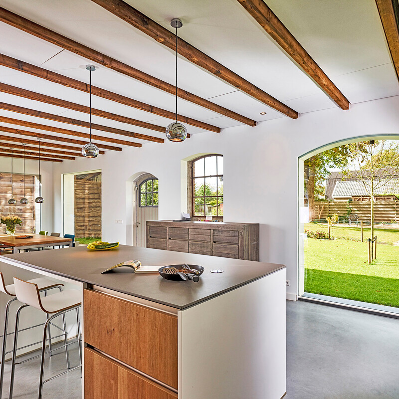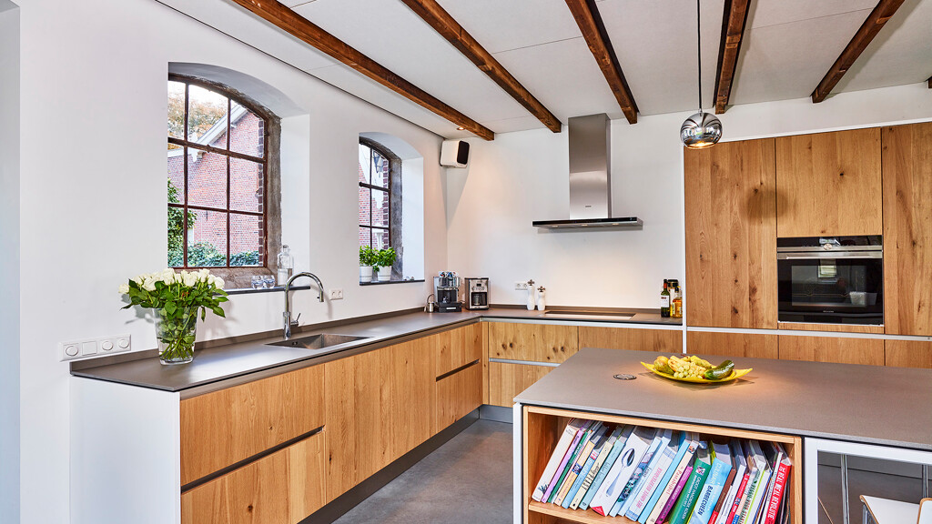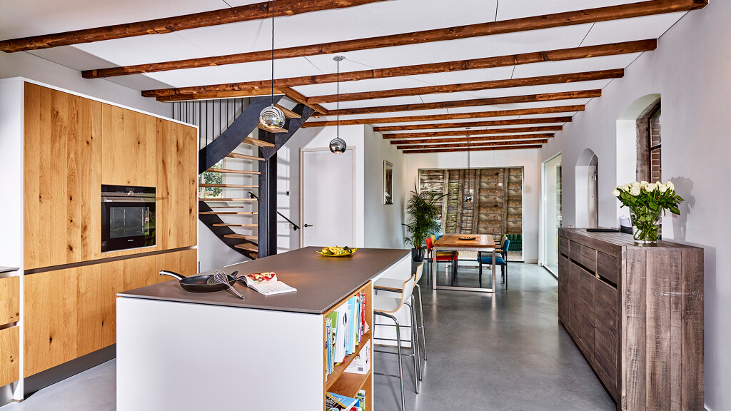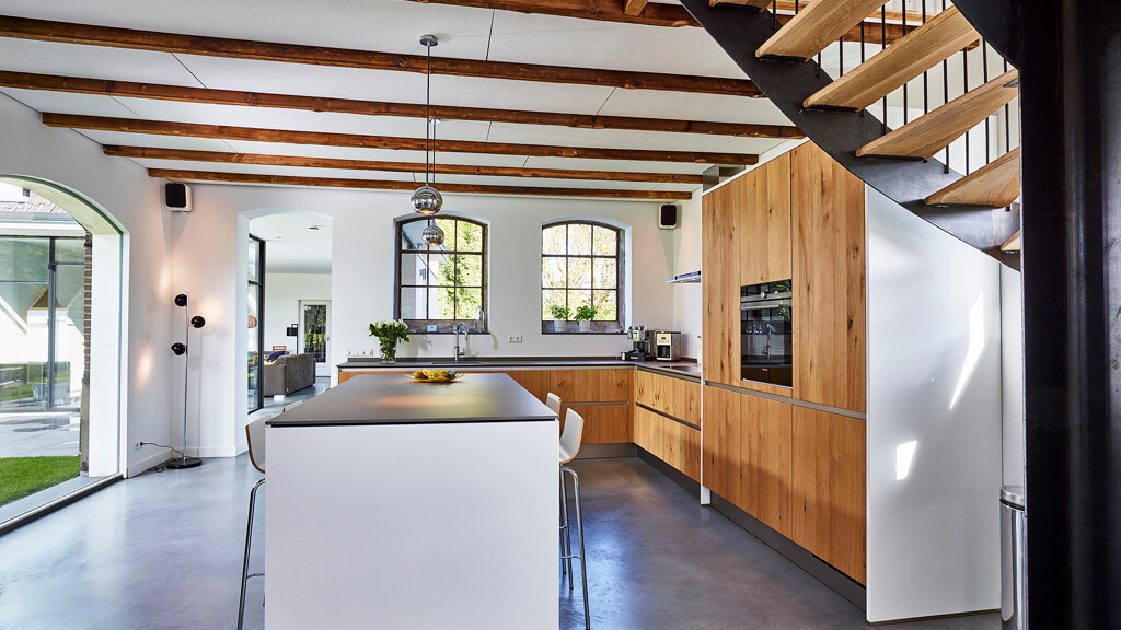 In een voormalige smidse in het groene hart van Nederland mochten wij deze prachtige eiken woonkeuken plaatsen. De Manufaktur-fronten van geborsteld knoestig eiken zijn handgemaakt en komen uit onze eigen werkplaats. Ze zijn voorzien van een extra dik echthoutfineer, waardoor ze niet van massief houten fronten te onderscheiden zijn. Het 12 mm dunne werkblad is van keramiek: Neolith Satin Cement. Het ruime eiland biedt plaats aan vier barkrukken. Deze gezellige familiekeuken is voorzien van een Quooker Flex en Studio-Line apparatuur van Siemens, onder andere een combi-stoomoven, een koel-vriescombinatie en een 80 cm brede induktiekookplaat.